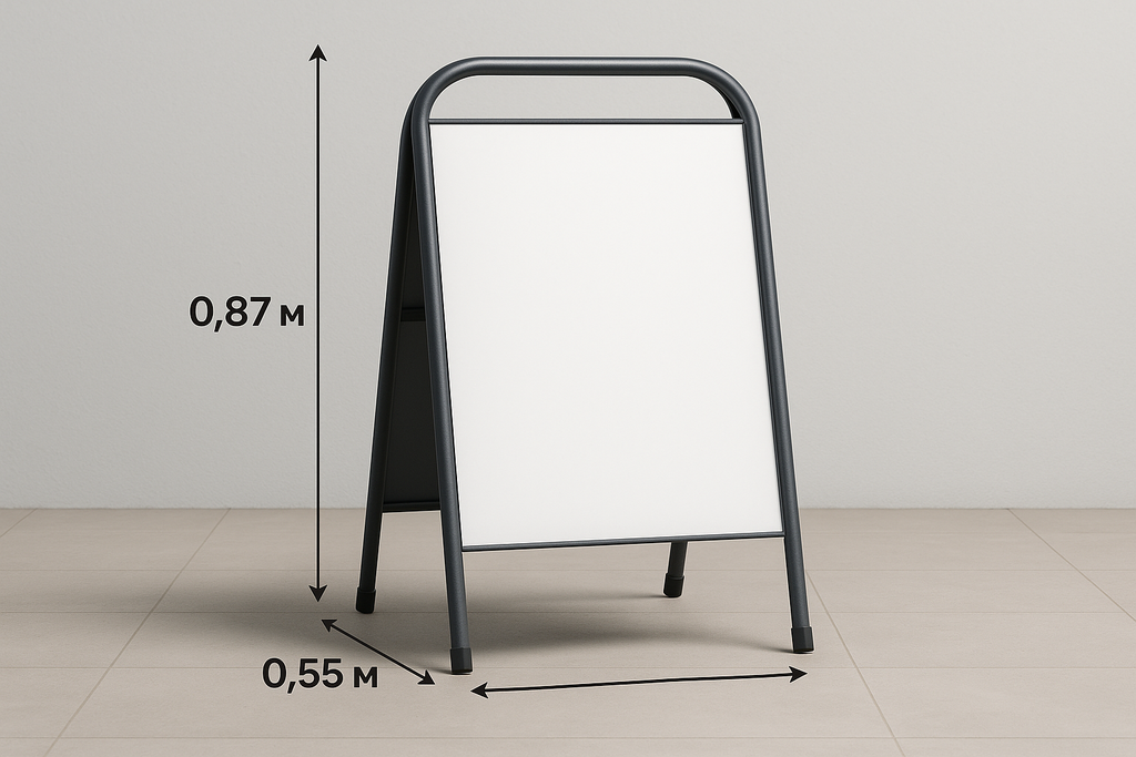 Размер рекламного поля — 0,87×0,55 м, что делает модель идеальной для ограниченных пространств, но достаточно заметной для прохожих.