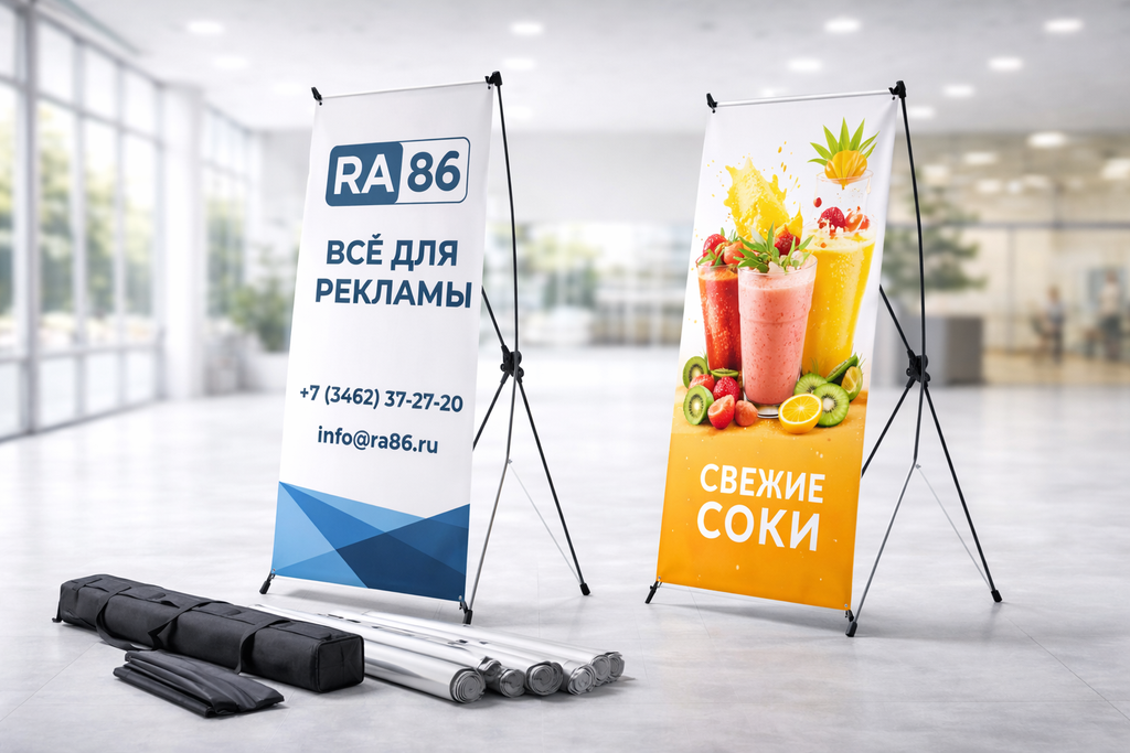 Компания RA86 изготавливает X-баннеры с печатью под ключ: баннер, каркас, помощь с макетом и доставка. Это оптимальное решение, если нужен бюджетный стенд с быстрым изготовлением и аккуратным внешним видом.